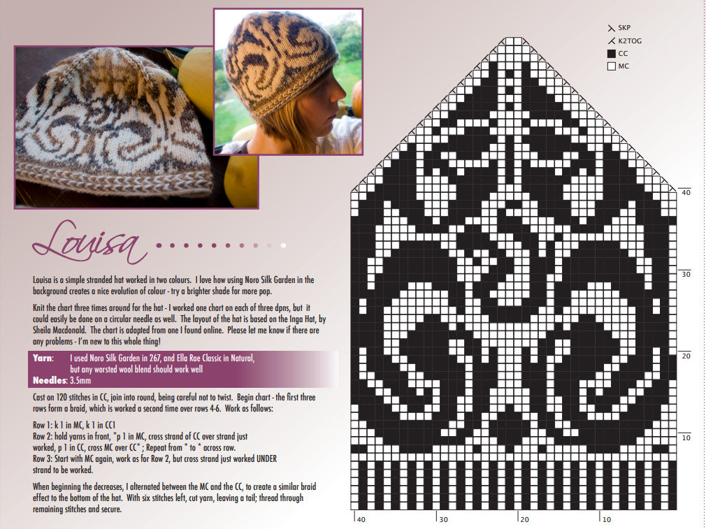 Внешнее оформление шапки – это узор с перемещенными петлями. Размер шапки примерно на 56 размер головы. Изначально набрать итальянским набором 152 петли. Провязать двойной резинкой любого типа длиной в 4 см. Длина узора будет около 13 см. количество петель, кратное 23 + 6 петель и еще 2 кромочные. Начиная с шестого ряда, узор повторить со 2 ряда. После 13 ряда делать равномерные убавления в каждом лицевом ряду. Постепенно подключить в убавления и изнаночные рядки. После провязывать по 2 лицевые, пока не останутся всего 10 петелек. Окончание делать как и во всех предыдущих вариантах. Более доступная схема для осваивания техники —