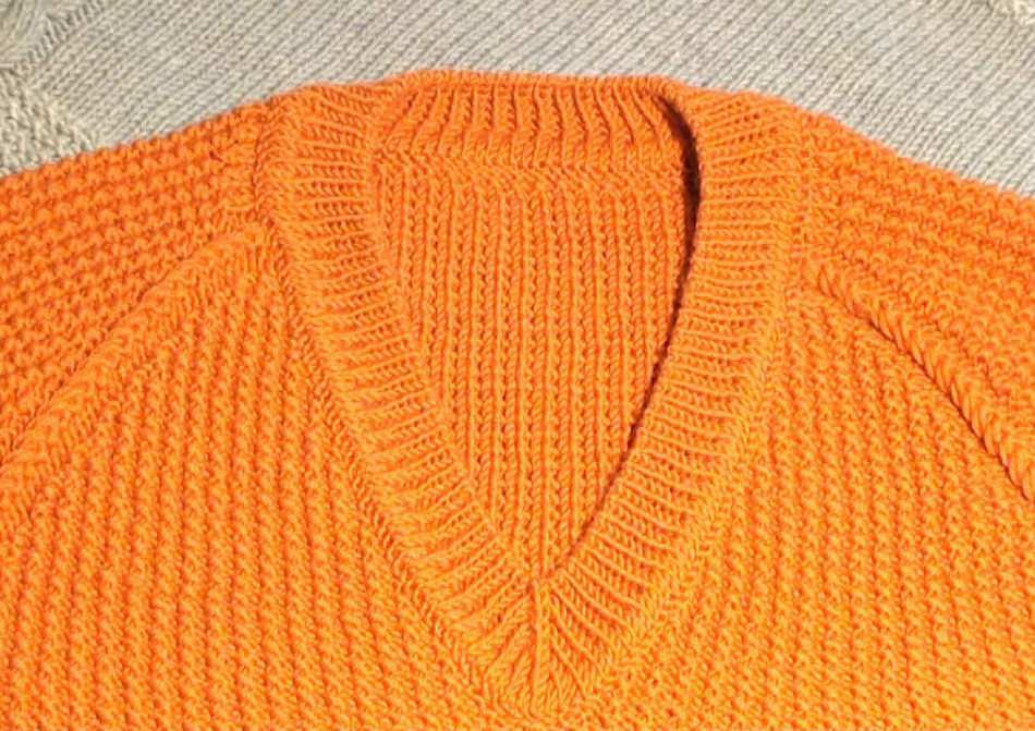 V-образный вырез оформить можно, практически, такими же методами, что и округлый или прямоугольный. Горловина спицами обвязывается отдельной бейкой, или же бейку сразу соединяют с петлями горловины, тогда она выходит цельнокроеной и вяжут ее круговыми спицами.