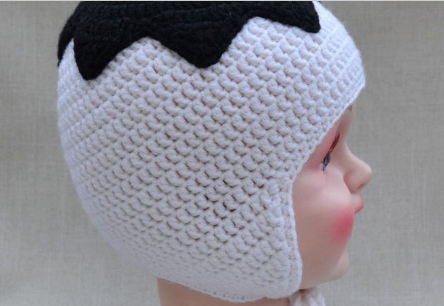 Теперь берем пряжу черного цвета и обвязываем весь край шапочки столбиками без накида до середины ушка шапочки. Как только дойдем до этой точки, провязываем 30 воздушных петель.