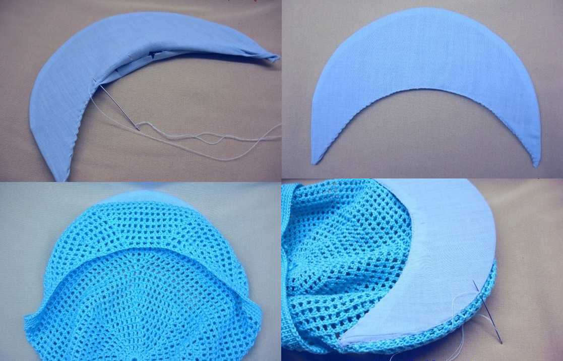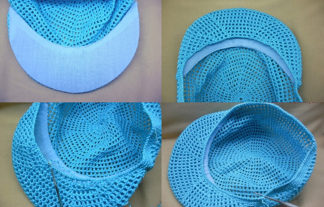 Коз-к кепки выверните на изнаночную сторону и приложите к нему сверху обшитый жесткий. Пришиваем к кепке. Выворачиваем обратно и обвязываем край кепки полностью по кругу один ряд столб.без нак. Следующий ряд — <<рачий шаг>>. После него убираем нить и пришиваем оставшийся край коз-ка.