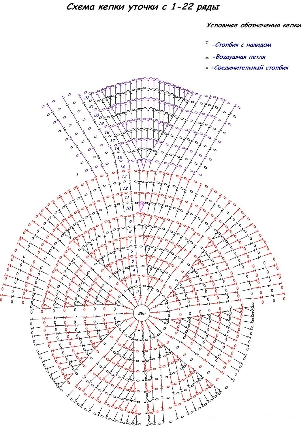 В двадцать седьмом р.: до коз-ка по краю кепки вывязываем столб.без нак. От коз-ка начинаем: два столб.без нак. в возд.пет.пред. ряда, еще один столб.без нак. в первый столб.с нак. сетки коз-ка. Далее продолжайте вывязывать козырек с убавл.по схеме, также как и в двадцать шестом ряду.