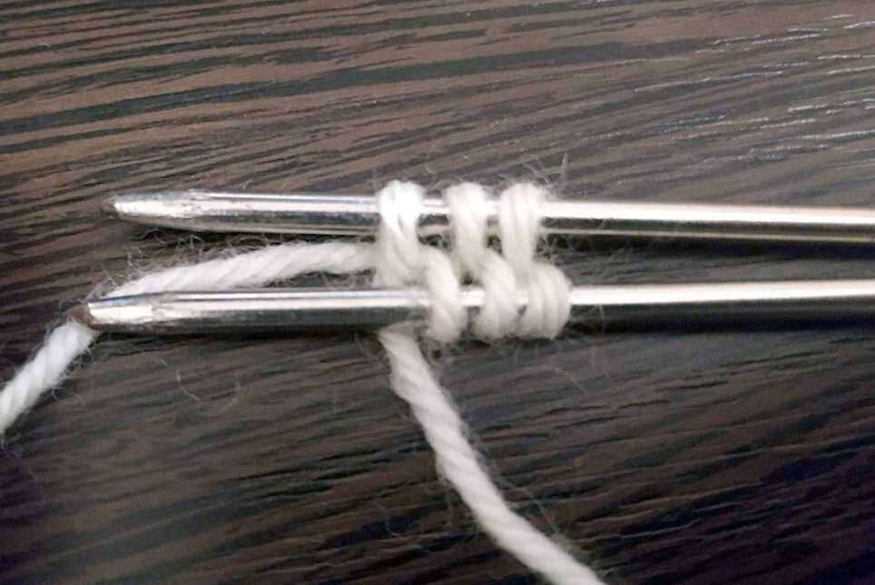 Вторую петельку также затягиваем у себя на спицах. Точно таким же способом набираем столько петель, сколько нам нужно. В результате вытаскиваем одну из спиц и всё готово. Можно приступать к вязанию. Отметим, что набор на 2 спицы делается с целью того, чтобы петельки были свободными, что значительно упростит вывязывание первого рядочка.Утолщенный край. Если вам необходимо сделать край трикотажной ткани более плотным и массивным, то его нужно будет укрепить. Для этого при наборе петель на 2 спицы сложите кончик пряжи, из которой формируется петелька, в 2 или 3 раза. Однако толщину нитки, которая двигается в направлении указательного пальца необходимо оставить такой же, какой она и была изначально.