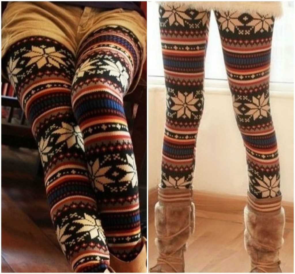 Еще один тренд зимнего сезона – это теплые вязанные леггинсы с узором, изображающим оленей. Их носят с однотонными длинными свитерами или туниками, высокой обувью и меховой шапкой. В таком наряде будет уместно пойти на городской ледовый каток или отправиться в поездку. В таком комплекте можно встретиться с друзьями или пойти на свидание. Модный образ могут дополнить теплые сапоги – угги и укороченный пуховик.