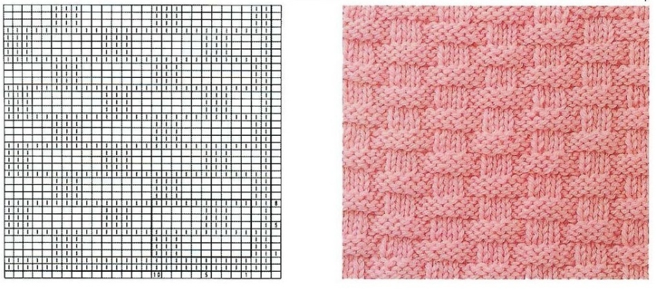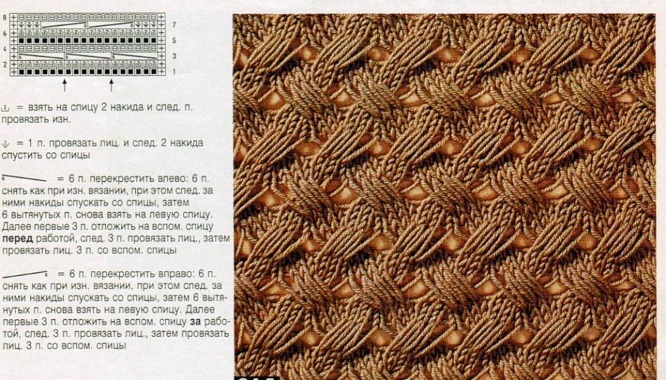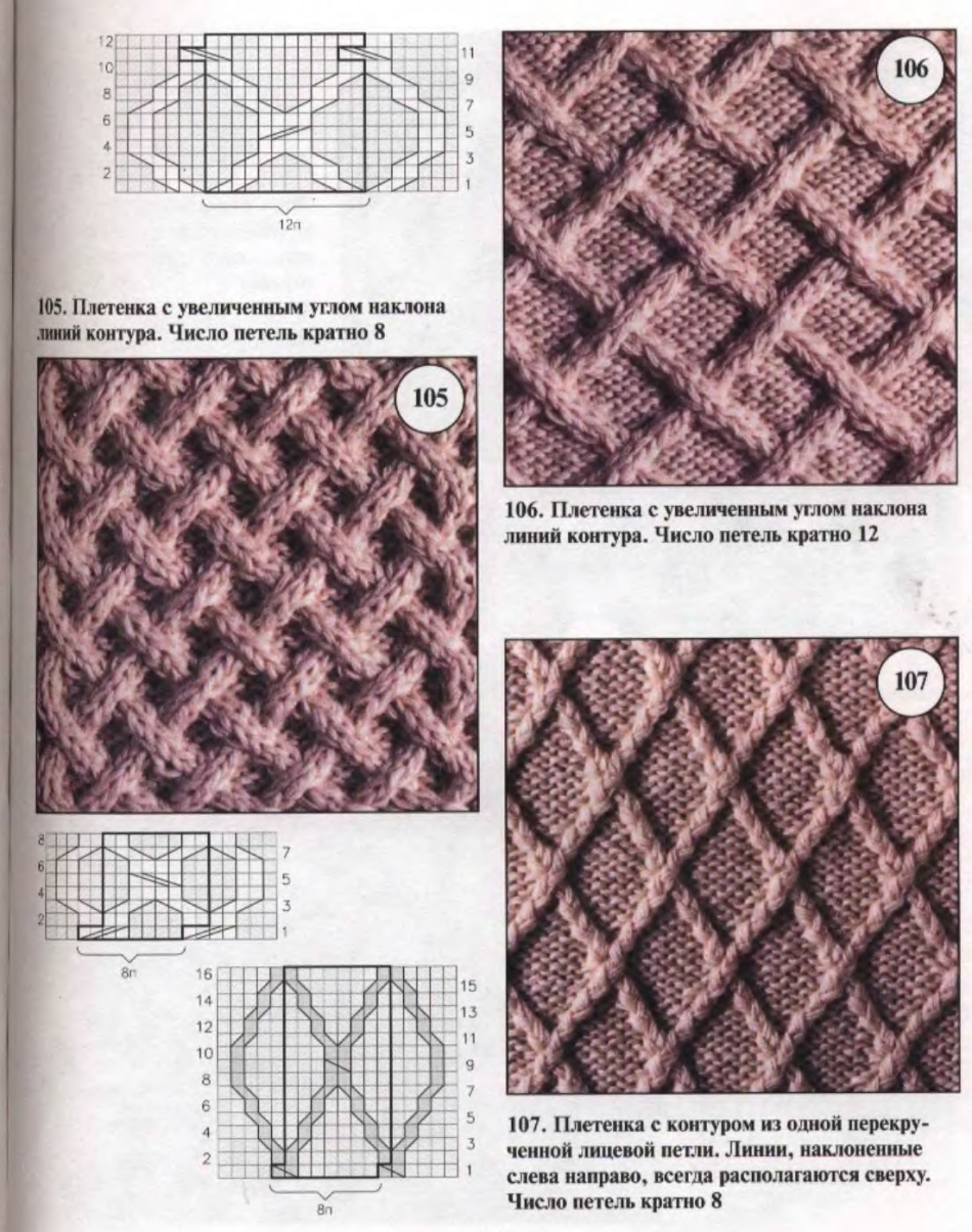 схемы узора плетенка, вариант 3Благодаря перекрещиванию петель в лицевых рядах, полотно выходит достаточно плотным и держит форму.