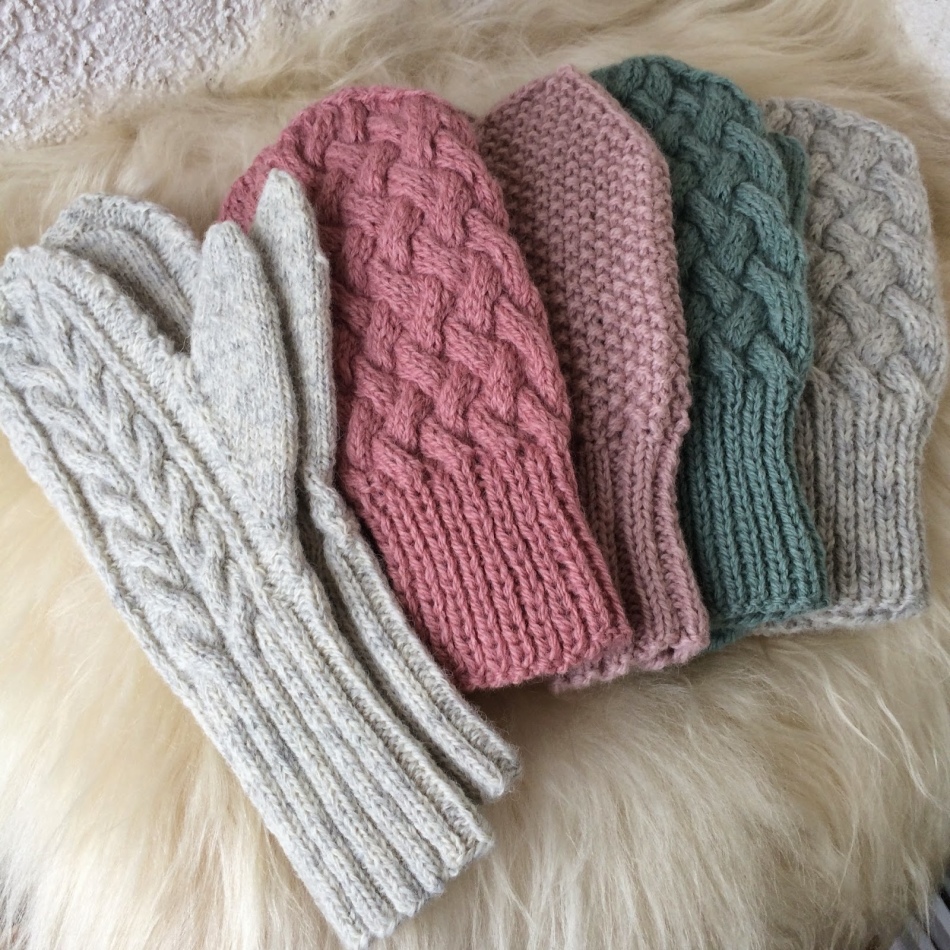 несколько пар готовых варежек с узором «плетенка»Если ваша задача — связать теплые варежки в один слой, которые будут плотно сидеть на руках и обеспечивать тепло, то остановите свой сбор на узоре «плетенка».