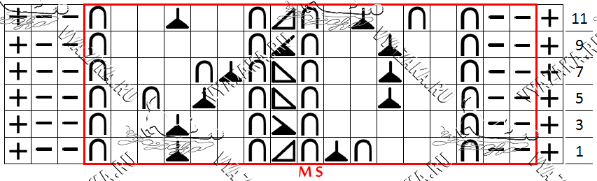 Количество петель в ряду и число рядов в раппорте узора такое же, как и в предыдущем узоре (схема №2).