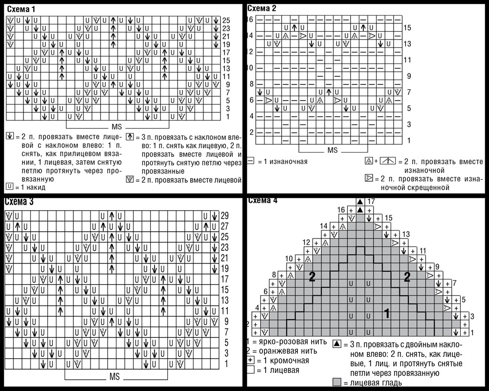 Основной узор 1: см. схему 1. На схеме изображены только лицевые ряды, петли в изнаночных рядах вязать по рисунку, накиды провязывать изнанкой. Ряды 1. — 4. постоянно повторять. 1 клетка на схеме = 1 п. х 2 р.