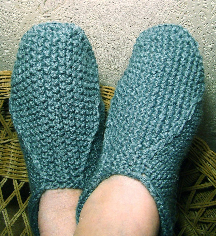 Прямоугольные. Гениальное и самое простое решение, когда вывязывается обыкновенный прямоугольник, а затем его просто сшивают. Шов получается на подошве. Просмотр мастер-класса даст полое представление о работе. Этот вариант для тех, кто предпочитает вязать тапочки на двух спицах.