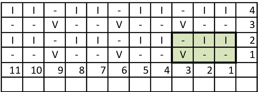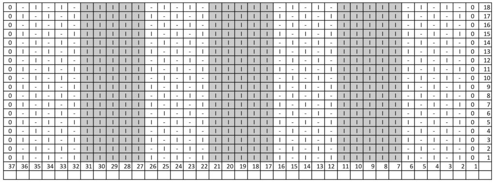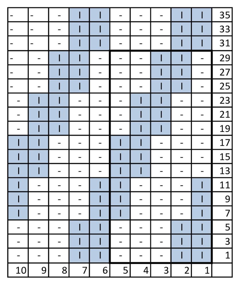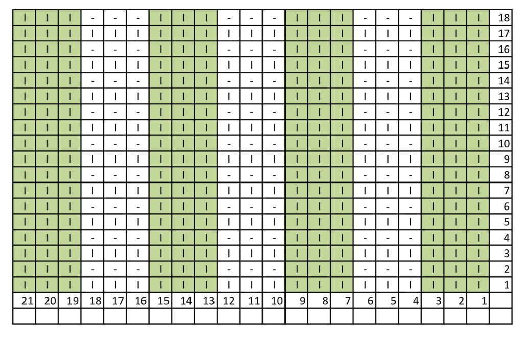 Схема вязания узора. С лицевой стороны все петли вывязываются лицевыми. С изнаночной стороны в местах, указанных на схеме вывязываются изнаночные петли, остальные — лицевые.