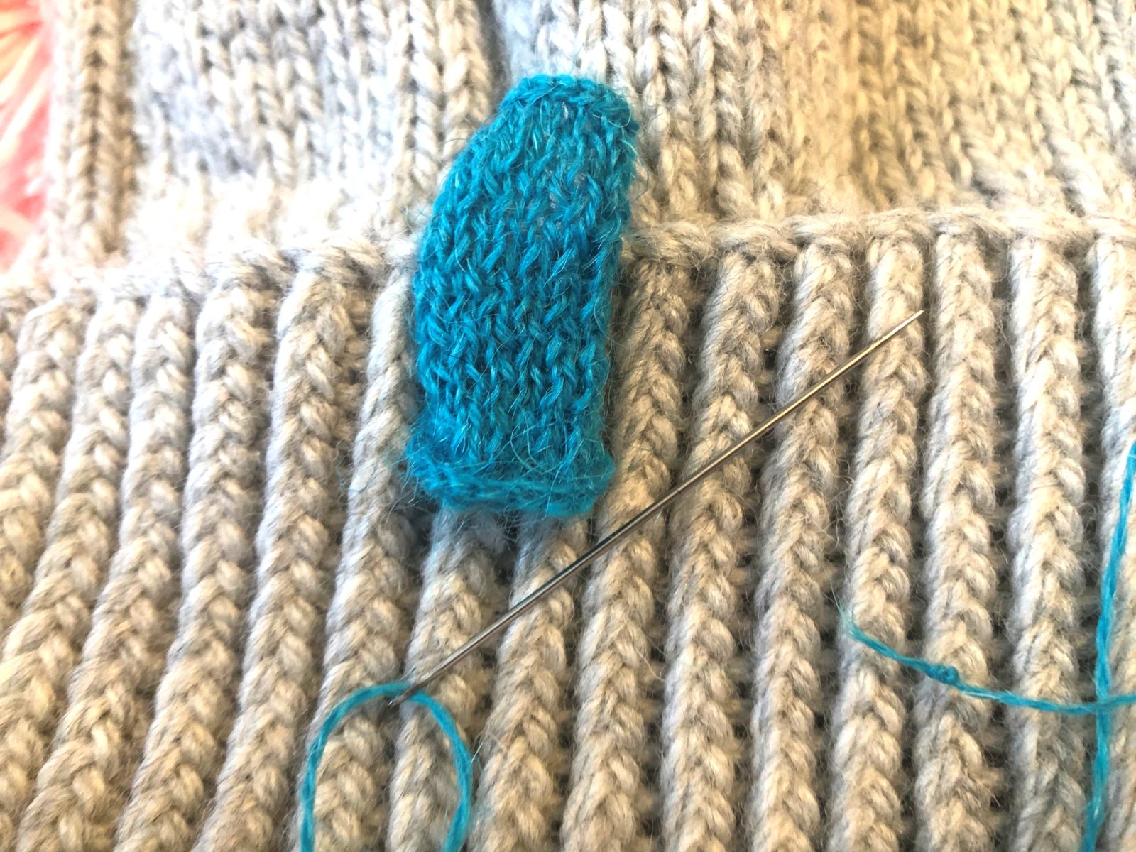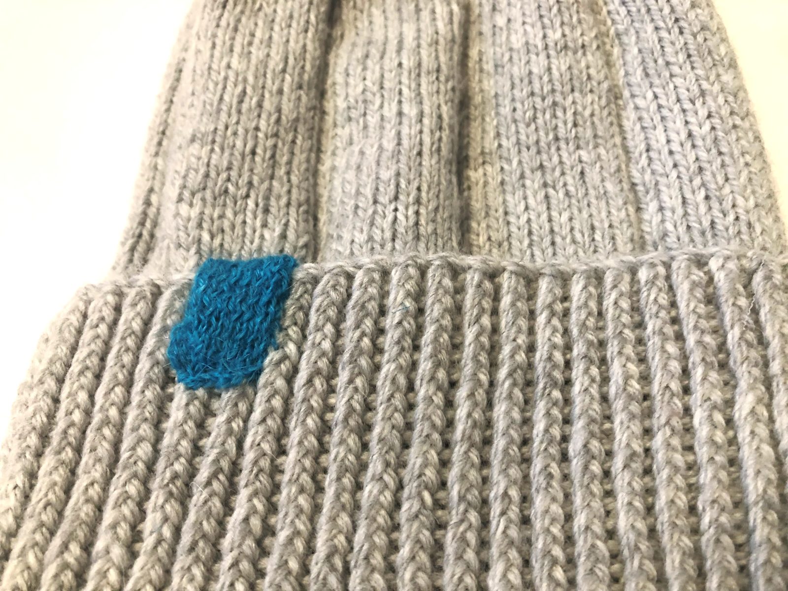 Нашиваем бирку на резинку шапки таким образом, чтобы она как бы обхватывала ее.