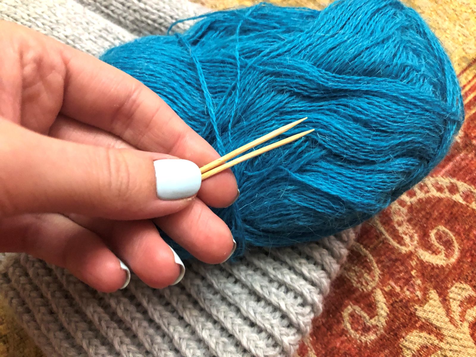 Нам понадобятся остатки тонкой пряжи (в данном случае — голубой) и две спицы 2 мм. У меня под рукой не было подходящих спиц, поэтому я воспользовалась зубочистками. Как известно, все рукодельницы те еще выдумщицы