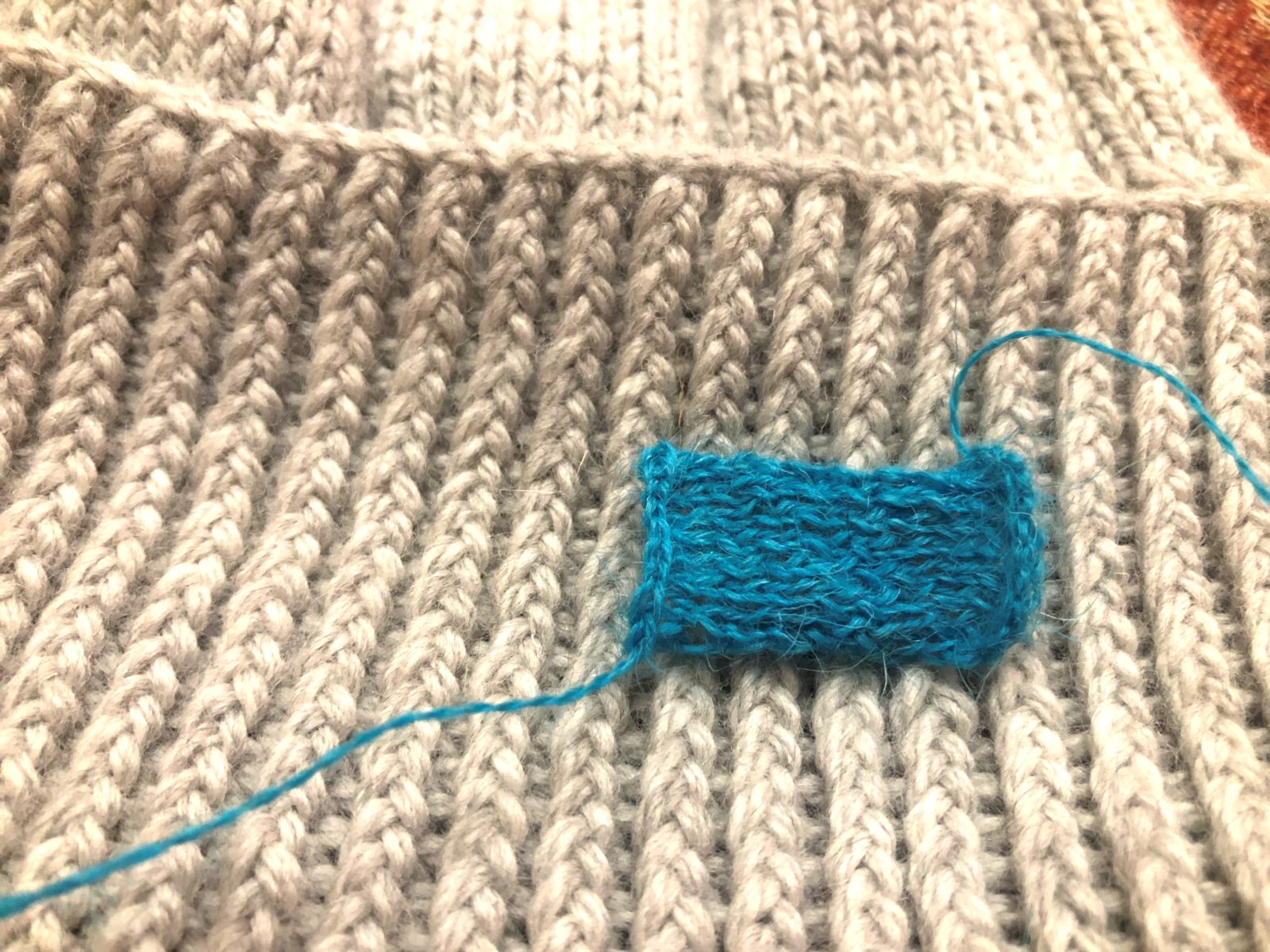 - Перенести все петли на более крупные спицы и продолжить работу английской резинкой. При двухцветном круговом вязании это означает, что одной нитью следует вывязывать только лицевые петли, а другой – изнаночные.