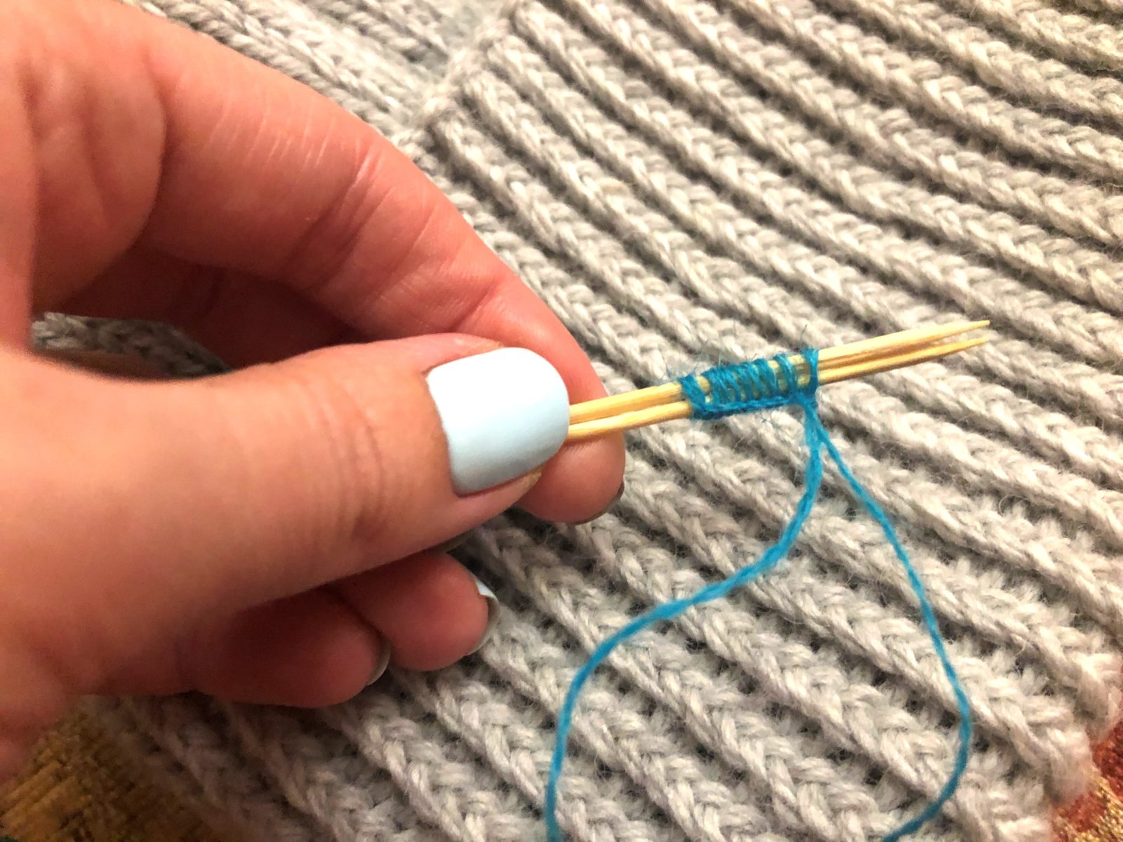 Когда будет удобно (мало петель), переходим на обоюдоострые спицы.