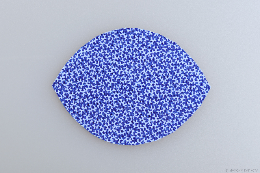 Вырезаем их и переносим на картон или плотный пластик. Далее нарезаем шесть квадратиков из синего плотного хлопка 8х11 см, складываем их вдвое в длину лицевой стороной вовнутрь, с помощью выкройки для лепесточка переводим контуры на ткань.