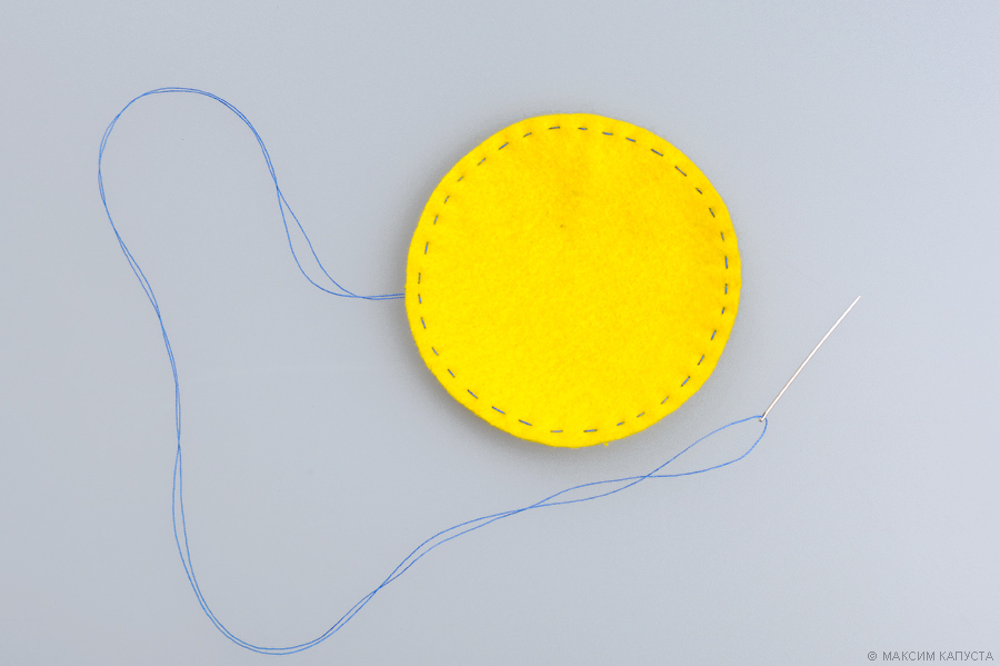Из кусочка жёлтого фетра выкраиваем самый большой круг, его диаметр должен составлять 8 см. По краешку круга проходимся намёточным швом, оставляя нитку с иглой.
