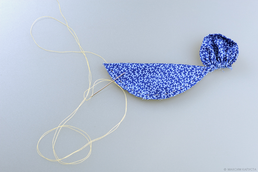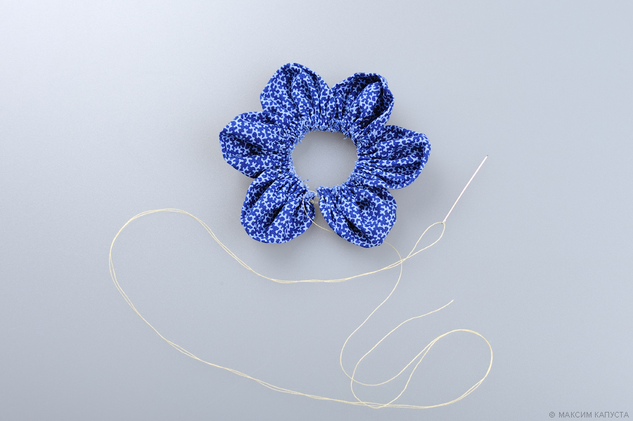 Затем нам нужно как можно сильнее стянуть нитку, образовывая лепесточек, и закрепить её, чтобы он не расходился в изначальное положение. Все той же нитью проделываем то же самое со всеми остальными заготовками лепестков.