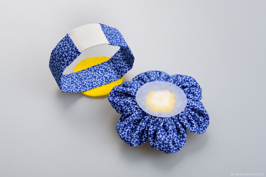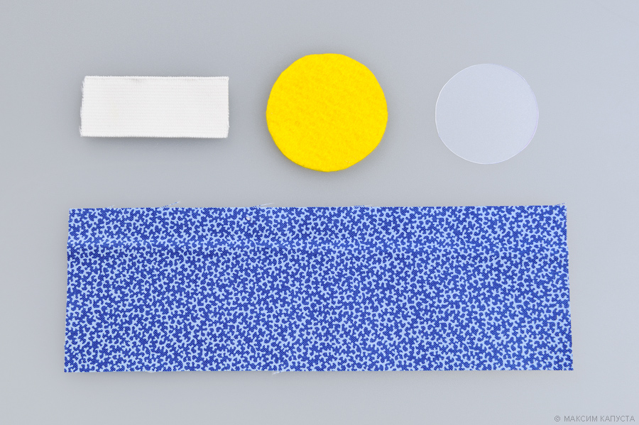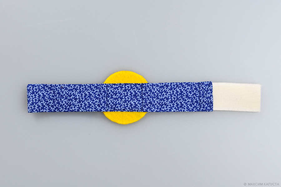 Тканевый прямоугольник складываем вдоль пополам лицевой стороной вовнутрь, прострачиваем две длинные стороны, выворачиваем на лицо. Браслет распрямляем и разглаживаем горячим утюгом. Пришиваем фетровый кружок диаметром 5 см в центр тканевого ремешка. Пришиваем резинку сначала к одной короткой стороне ремешка, затем – к другой.
