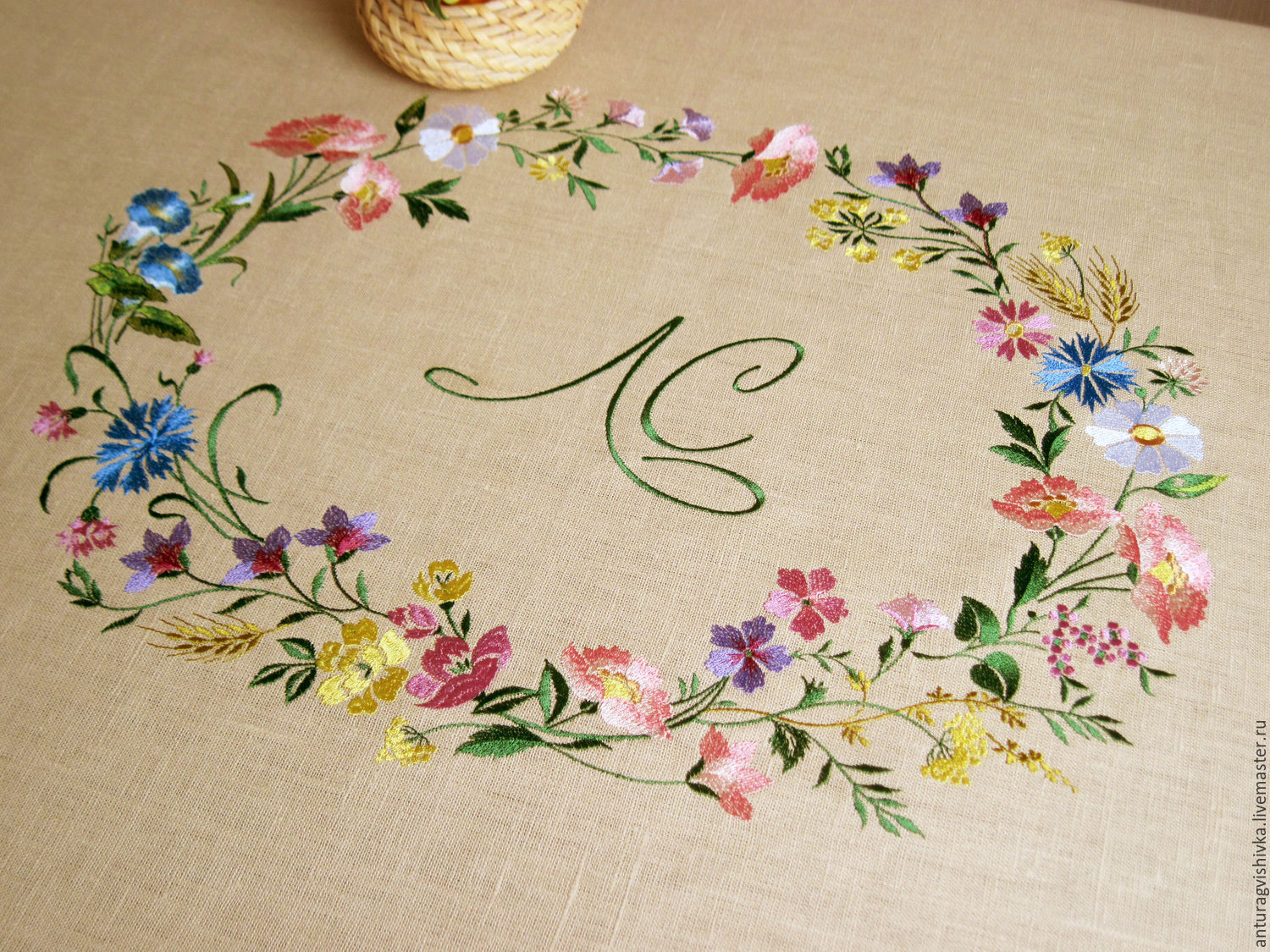 Вышивка цветов, будет располагаться по всем краям нашего полотна. Карандашом поставьте разметку со всех сторон, а особенно сердцевину. Наши красивые схемы, приложите к скатерти и прикрепите. Перенесите узор. Всю работу, заключите в пяльцы. Чтобы вышить такой рисунок, необходима гобеленовая иголка, которая не повредит ткань.