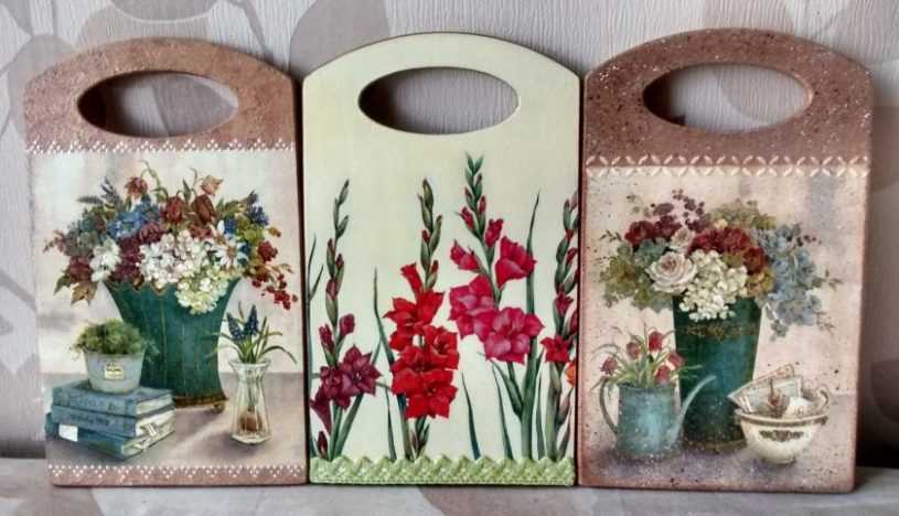 Подобным образом можно выполнить декупаж разделочной доски, оформить вешалку или другие предметы интерьера.
