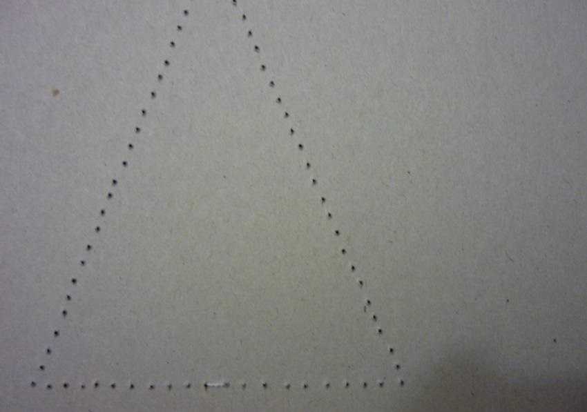 Берем лист бумаги и простым карандашом наносим на него треугольник, как на фото. Ставим отметки по всем сторонам фигуры на расстоянии трех-четырех миллиметров друг от друга. Скрепками крепим лист к картону любого цвета и делаем шилом отверстия в намеченных делениях. В результате получаем заготовку для елочки с дырочками.
