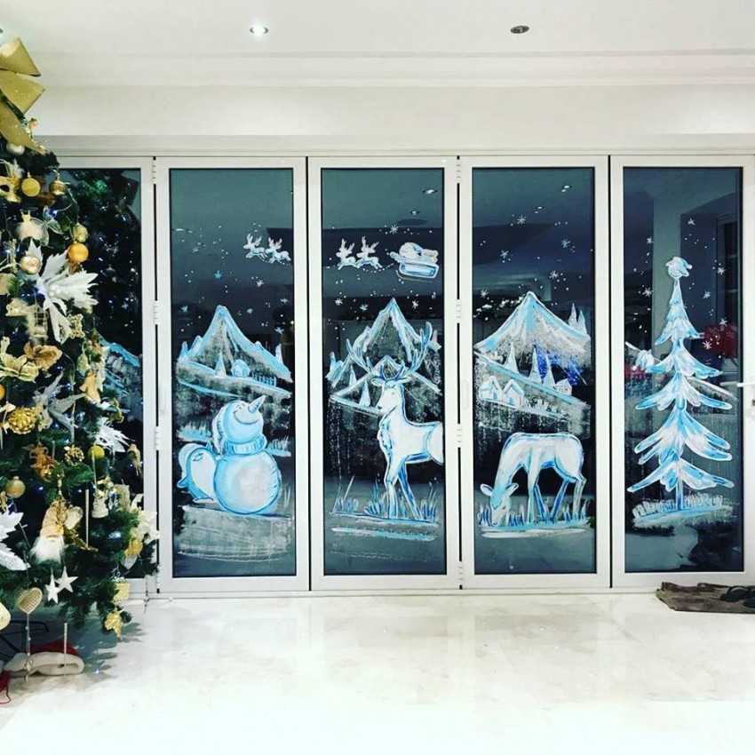 Можно сделать одну картинку на все стекло, выбрав базовый сюжет. Такие новогодние рисунки будут видны издалека — это одно из самых уникальных решений.