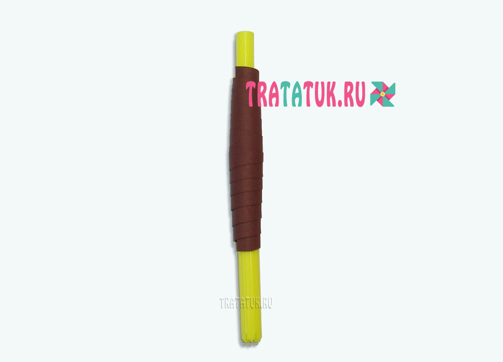 Вершину и непосредственно сам стебель нужно обмотать сначала используя скотч, а затем флористическую ленту (для вершины коричневого цвета, для стебля – зеленого).