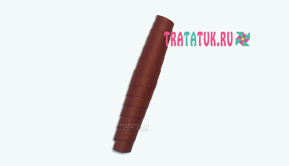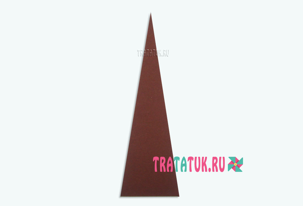 Для нее понадобится треугольный отрезок коричневого картона. Он должен быть довольно длинным, чтобы качалка камыша получилась достаточно объемной, а не тонкой, как шашлычная палочка. Исходя из размеров шашлычной палочки, приблизительные размеры треугольника могут быть таковы: узкая сторона – 8 см, а две длинные – 25 см и даже через всю длину листа А4.