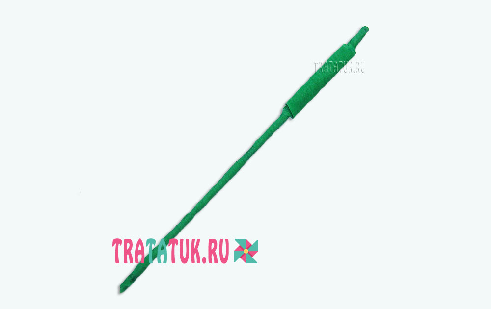 Отрежьте длинную полосу зеленой гофрированной бумаги, поместите капельку клея на тупой кончик палочки и начинайте гофрированной полосой ее обматывать, периодически закрепляя клеем. Клей также понадобится и на самом кончике палочки.