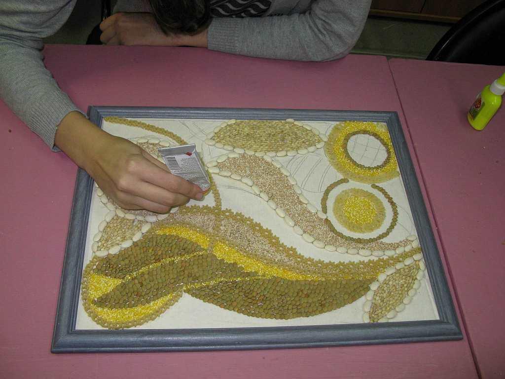 Раму для картины или холст целиком можно выполнить в технике мозаики. Материалом могут быть различные семена овощей, ягод и фруктов. Используются крупы самых разнообразных цветов и размеров.