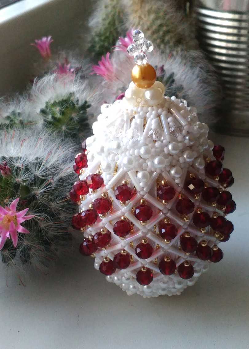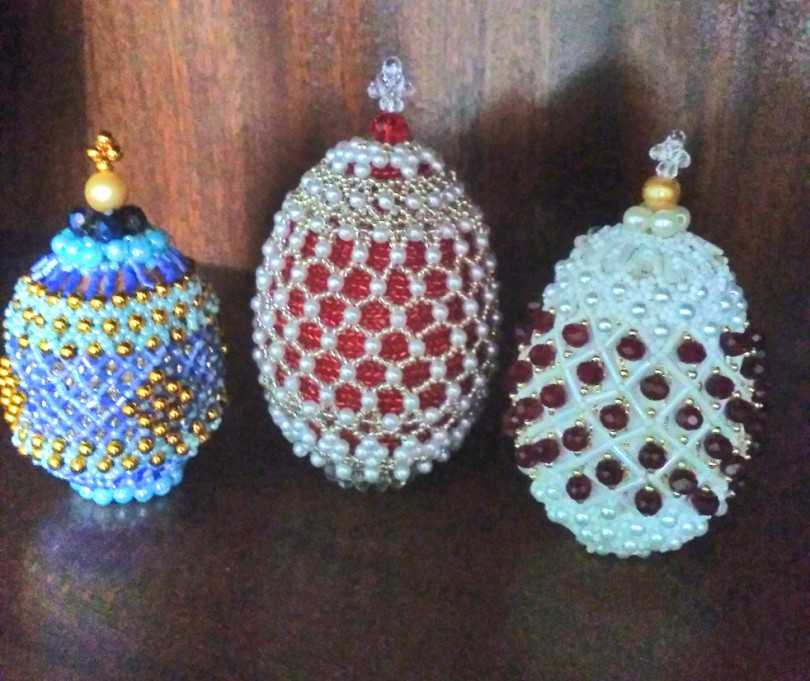 Основание оплетается ромбовидной сеточкой. Схема сетки из бисера несложная. Возьмите нить и наберите на нее необходимое количество бусин (обязательно кратное шести) так, чтобы она обхватила яйцо по диаметру в самой широкой его части. Завершите цепочку, пропустив иголку в конец первой бусины. У вас должен получиться «обруч».