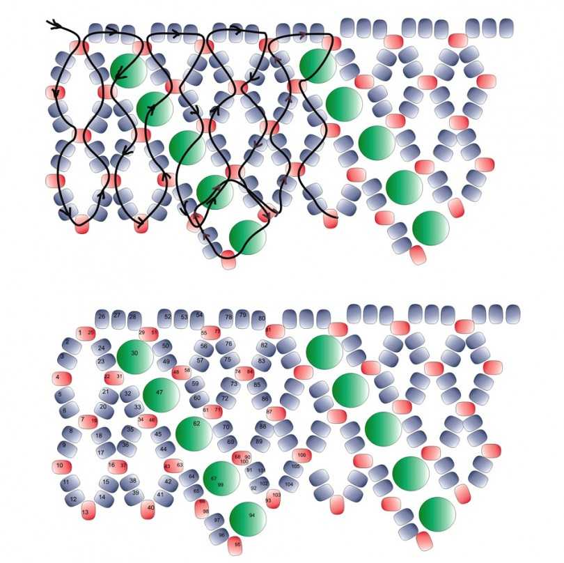 - Повторяем процесс с пятой бусинкой и возвращаемся к началу, чтобы пройти снова все бисеринки