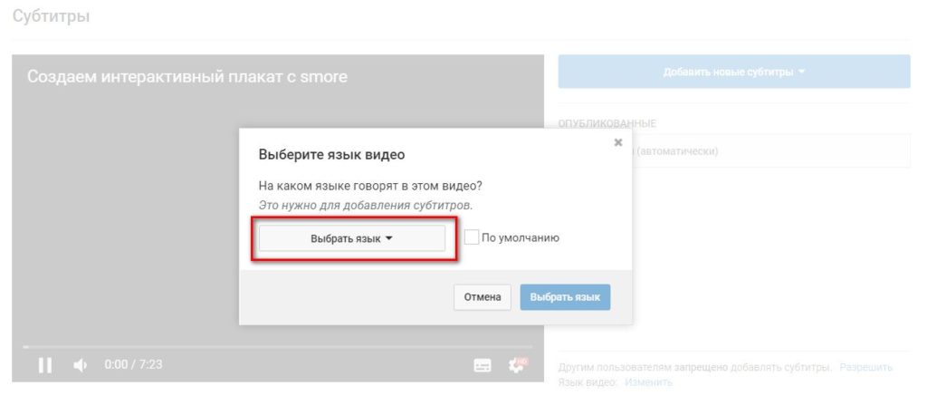 Б) Нажмите на кнопку «Добавить новые субтитры» и выберите язык видео. Таким образом мы создаем автоматические субтитры, которые грешат рядом неточностей.