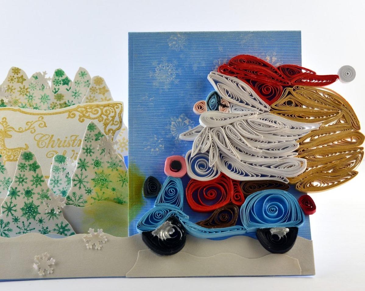 Кстати, используйте красивый картон, а также набор для квиллинга для своих поделок. В этой технике можно создать множество новогодних мотивов. Вам на помощь придут варианты открыток, фото.