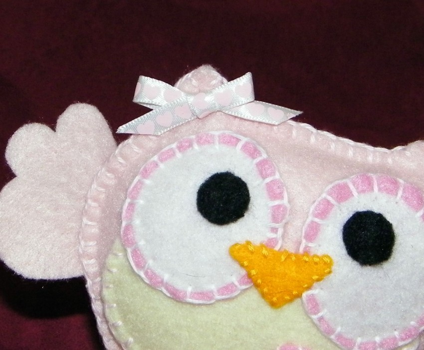 - Перед тем, как сшить туловище птичек, нужно сначала пришить (или приклеить) к нему все детали. Для первой совы это – глаза, нос и пузико. Для второй – глаза, нос и праздничная курточка.