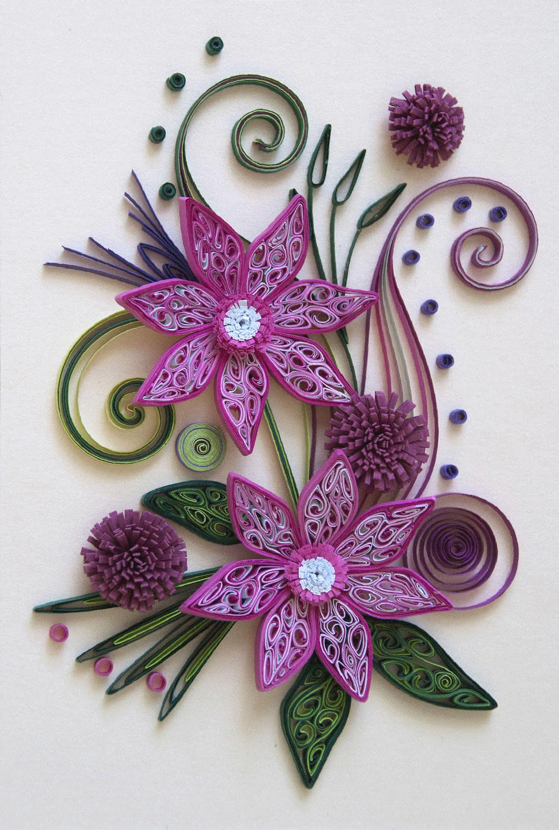 Работа готова. Цветы можно наклеить на плотный картон и сделать панно или оставить фигурками, доделав стебли из бумаги.Так, своими руками мы освоили петельчатый квиллинг на примере красивых декоративных растений.