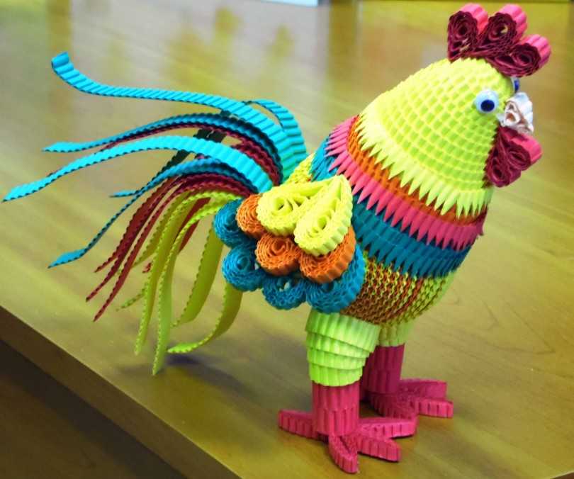 Работы из квиллинга можно делать объемными. Для этого нужна будет основа, например, пенопластовый или пластиковый шарик. Его обклеивают круглыми модулями небольшого размера. Затем добавляют лапки, уши, хвост, глаза. Забавными и милыми получатся розовый поросенок, золотая рыбка, яркая бабочка, петушок с радужным хвостом, пушистые цыплятки.