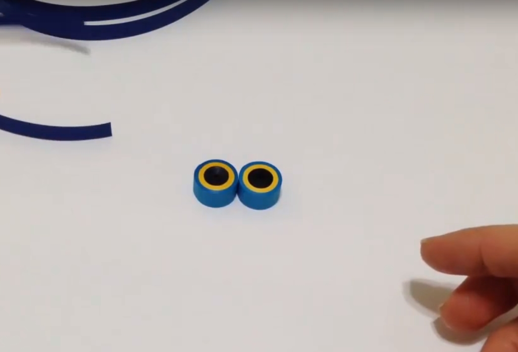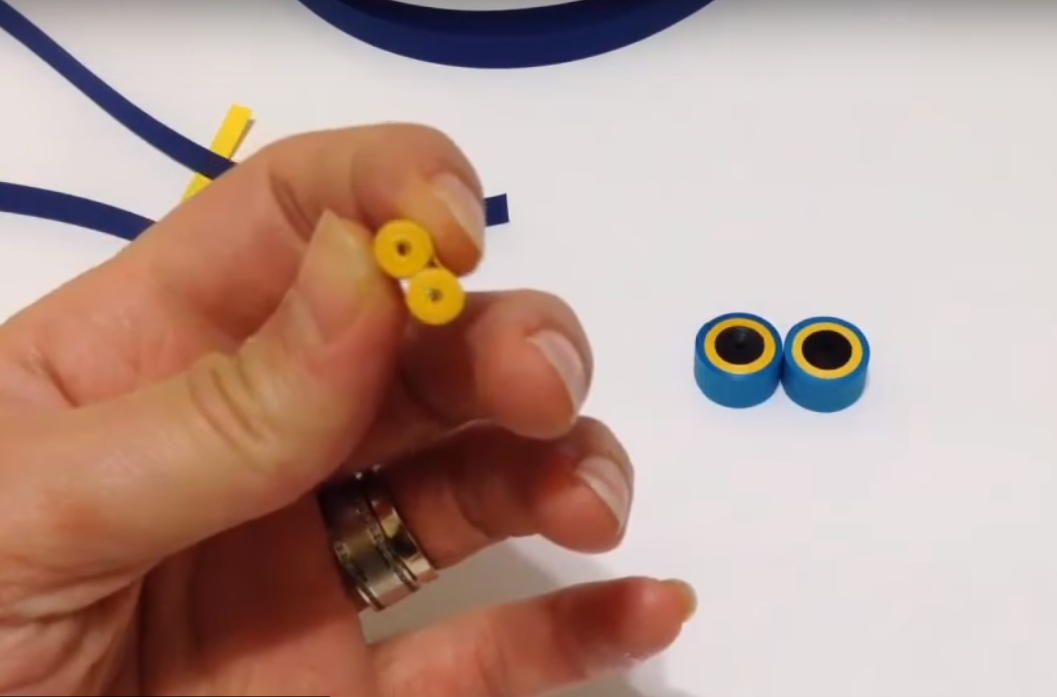 Собрав голову, отдельно делаем глазки. Для этого используем несколько различных по цвету полос бумаги, скрученных в тугой ролл. К глазам крепим «брови» в виде изогнутых «капель».