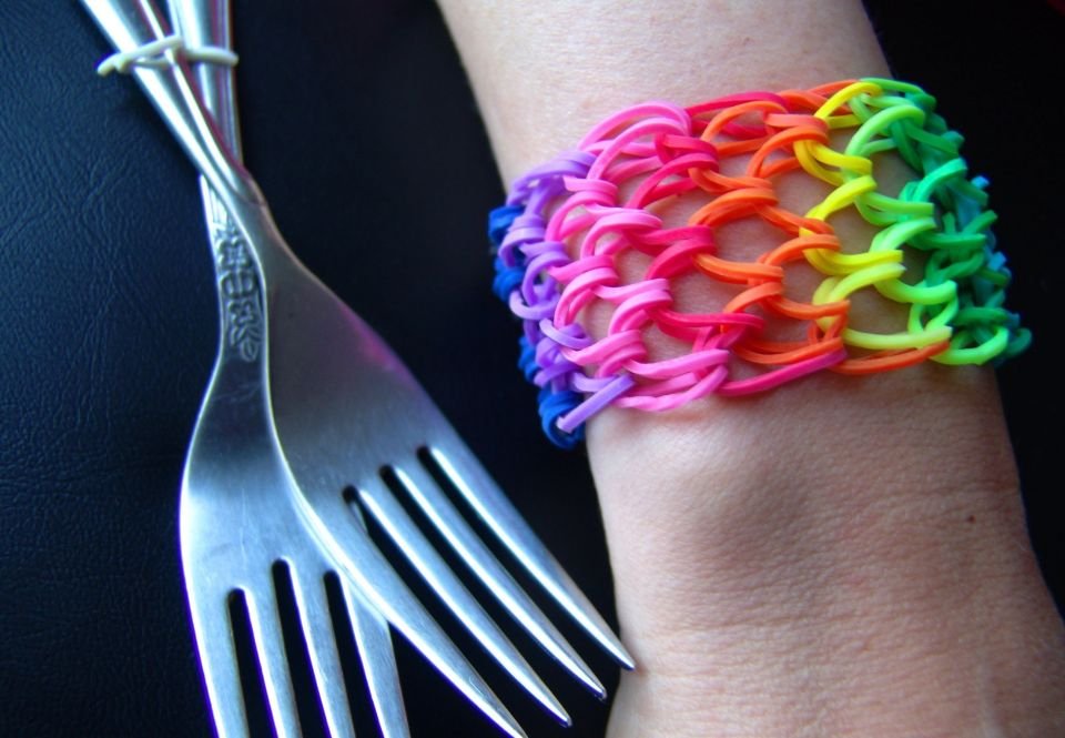 Но красивый широкий браслет можно сплети не только на станке или расческе, импровизированный самодельный станок из двух или четырех вилок, склеенных между собой скотчем, позволит изготовить достаточно широкий и массивный аксессуар на запястье. Как выглядит такой самодельный инструмент для плетения, вы сможете увидеть в видео уроках по изготовлению браслетов из резинок после текста.