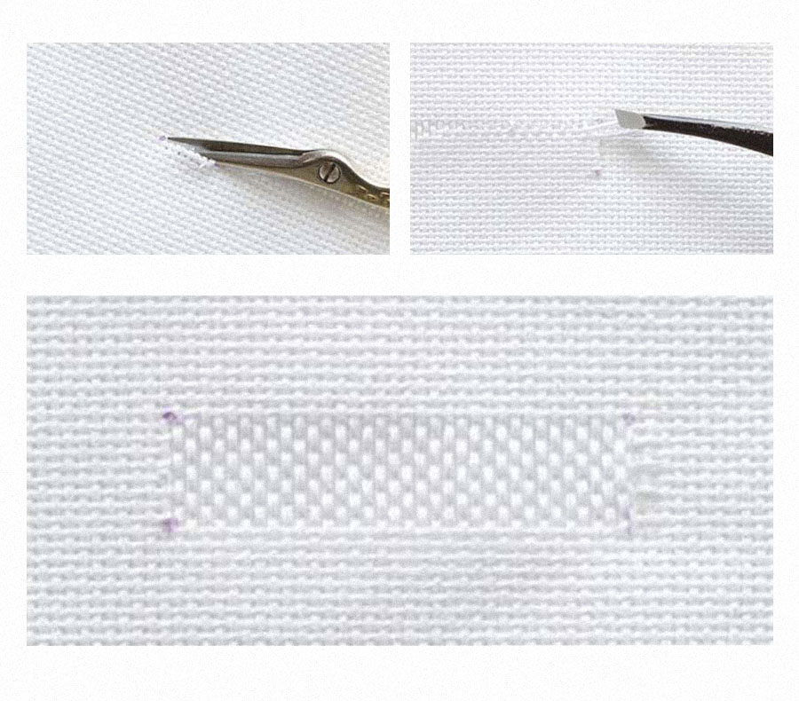 Для некоторых техник вышивки ткань нужно продёрнуть, то есть удалить нити утка на определённом участке основы.