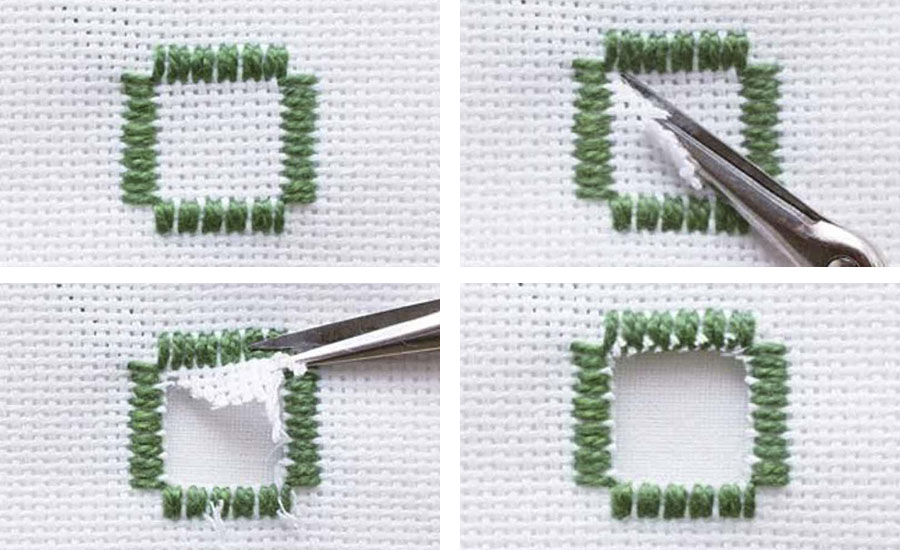 В некоторых техниках вышивки прорезают «окошки» на ткани.
