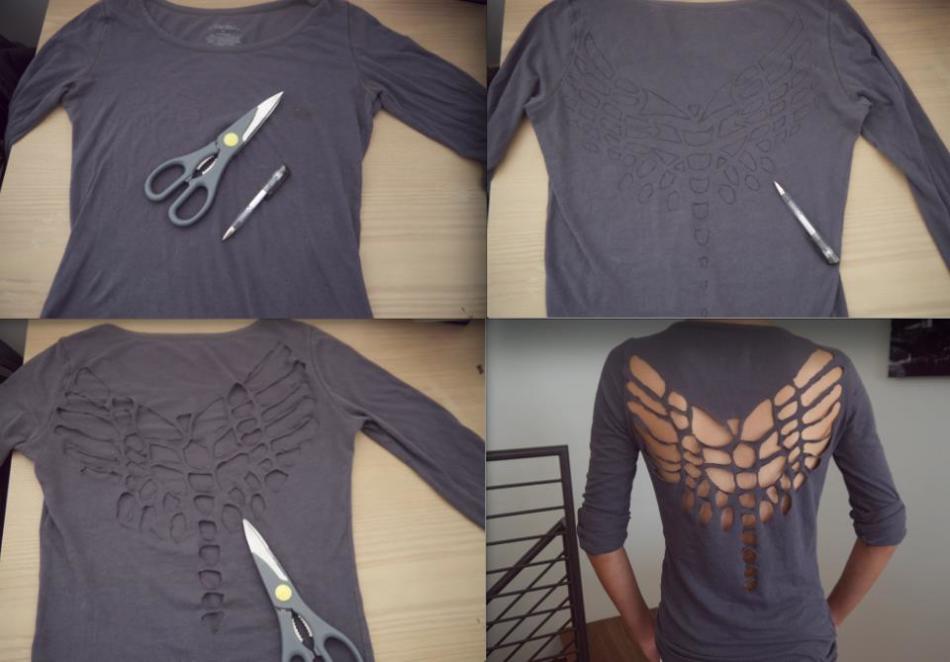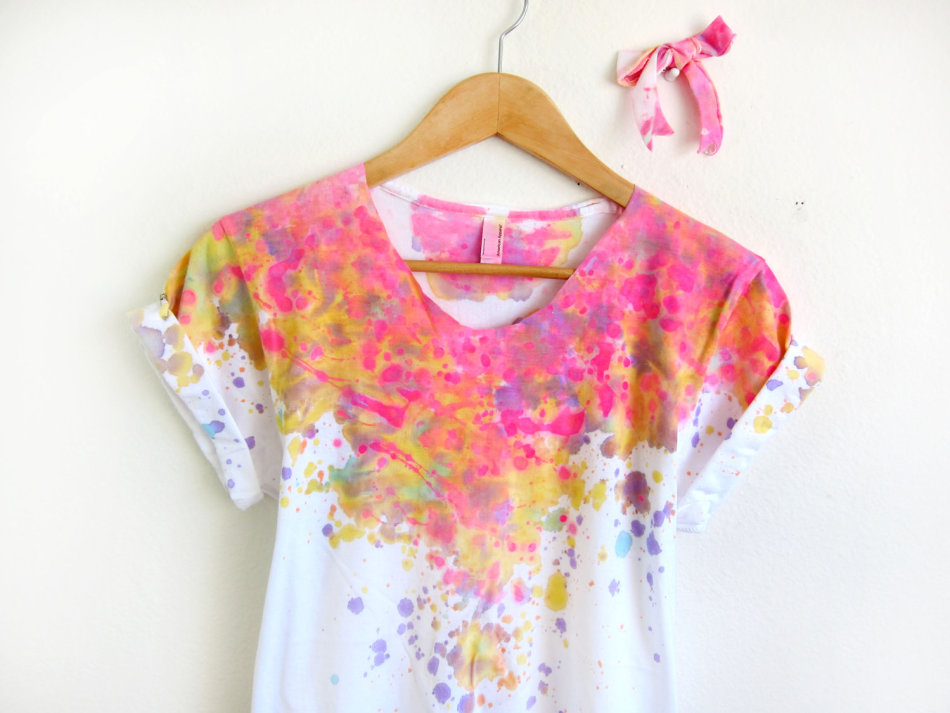 Одним из самых необычных способов является декорирование одежды краской. Для этого можно использовать специальную краску для рисования на одежде, а можно воспользоваться самой обычной технической. Попробуйте вырезать из картона шаблон: крест, сердце или любую другую форму. Положите шаблон на расправленную футболку и тонкой кисточкой наносите кляксы на вырез в шаблоне.