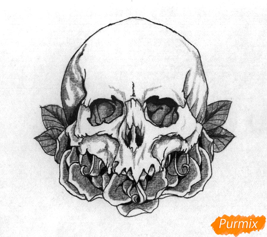 Растушуйте рисунок кусочком бумаги. Если он станет слишком бледным, то для получения яркости ещё раз заштрихуйте тёмные места. Теперь вы знаете, как рисовать череп с розами поэтапно