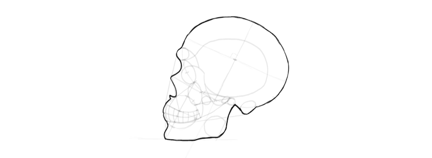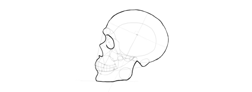 Твердым карандашом сделайте набросок главных черт. Лобную кость изобразите в виде круга, затем прорисуйте скуловые кости и нижнюю челюсть. Примерно отметьте глазницы и носовую щель, а также проведите полосу, где будут находиться зубы. Не давите на карандаш, ведь это набросок.