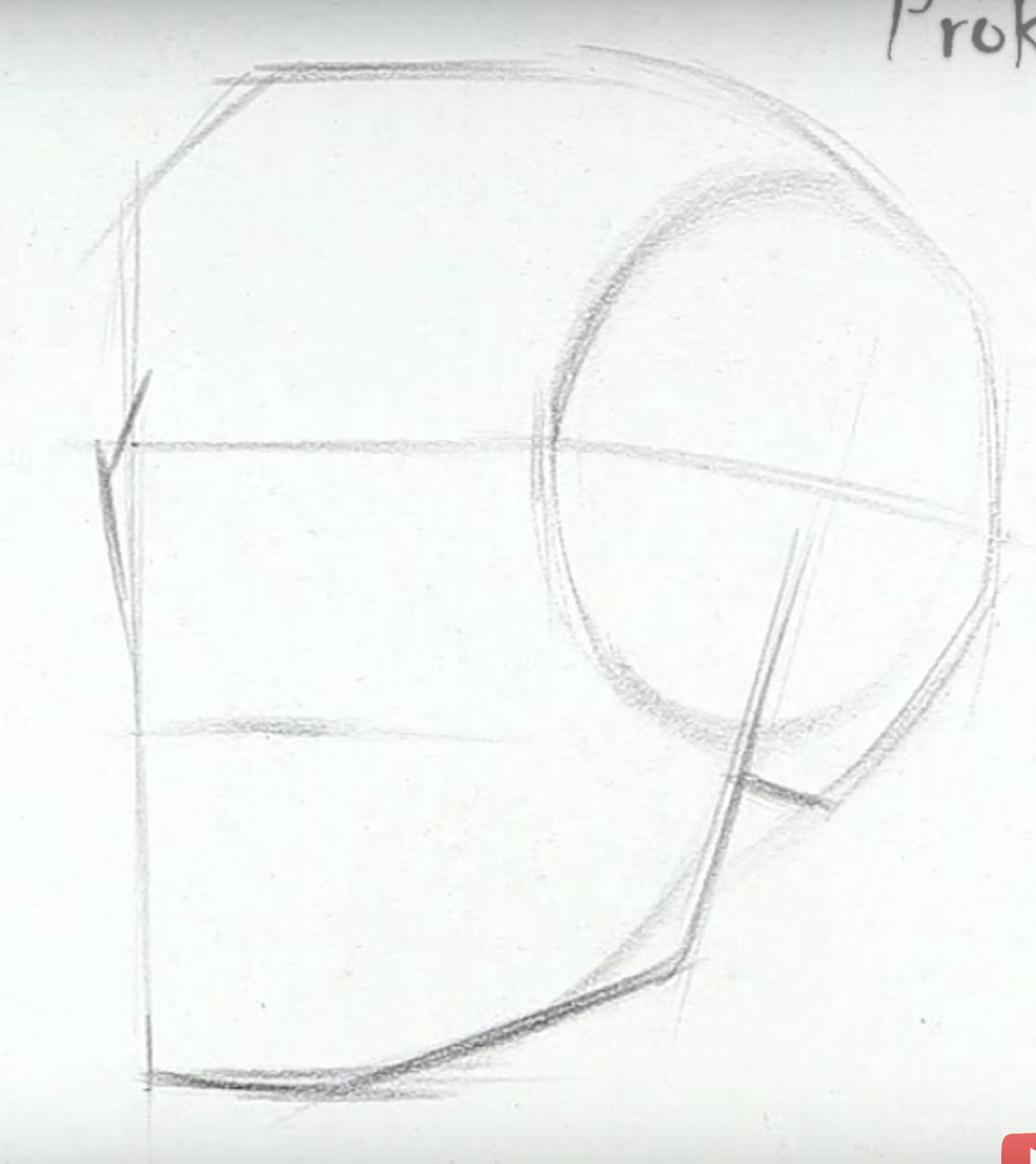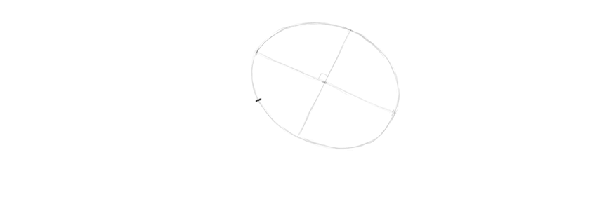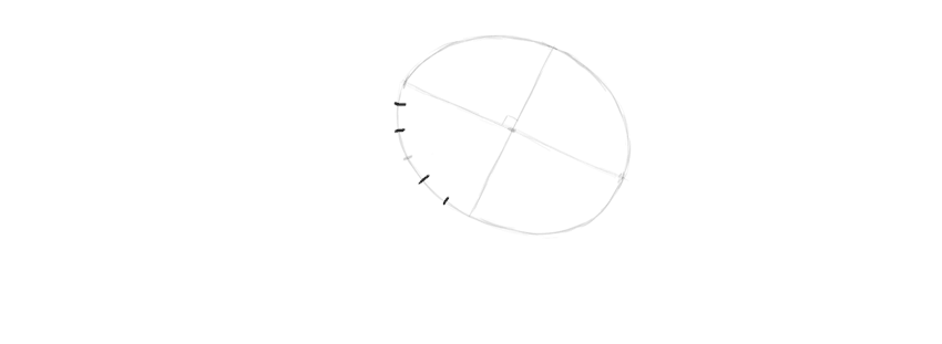 Наносятся линии, намечается основное очертание головы. Обрисовывается полукруг, а потом обозначаются очертания нижней челюсти и височной доли. Двумя горизонтальными линиями следует разделить лицевую часть.