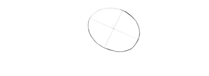 Этап 1 Начните свой рисунок с наброска. Очертите силуэт головы в развороте ¾. Обрисуйте полукруг, затем пририсуйте очертания нижней челюсти и выделите височную долю. Лицевую часть разделите двумя горизонтальными линиями.