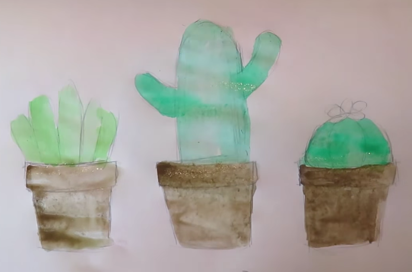 – Возьмем простой карандаш и нарисуем форму, после этого возьмем краски, сначала обведем форму кактуса, а после уже раскрасим. Когда высохнет краска, возьмем с вами более тонкую кисточку, окунем в белую краску и нарисуем крестики внутри кактуса.