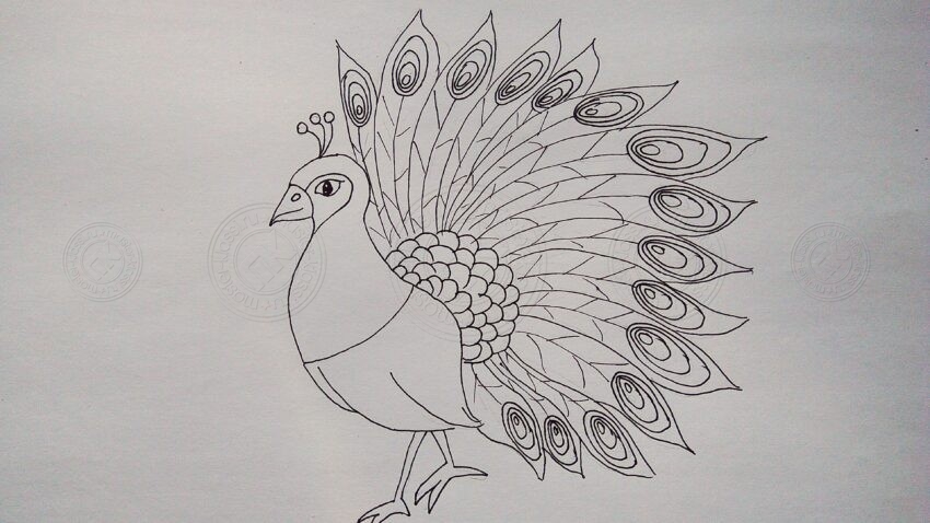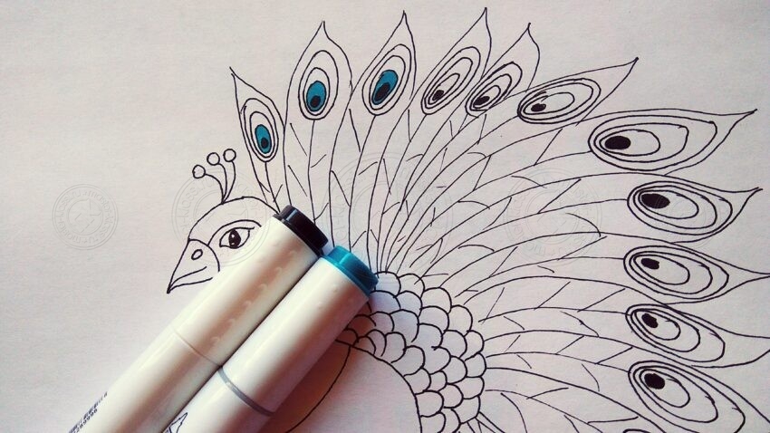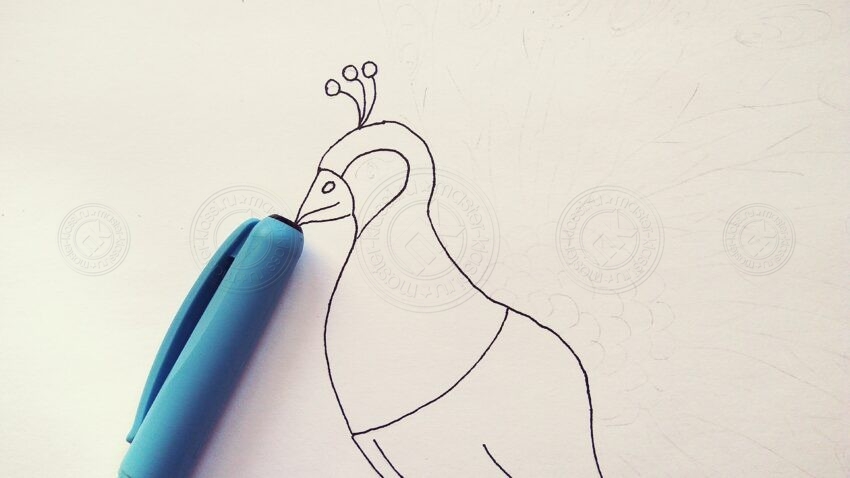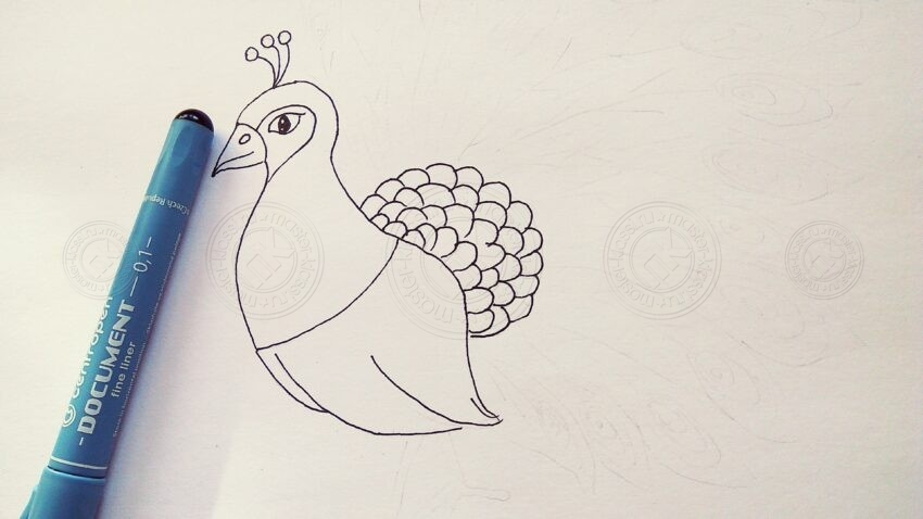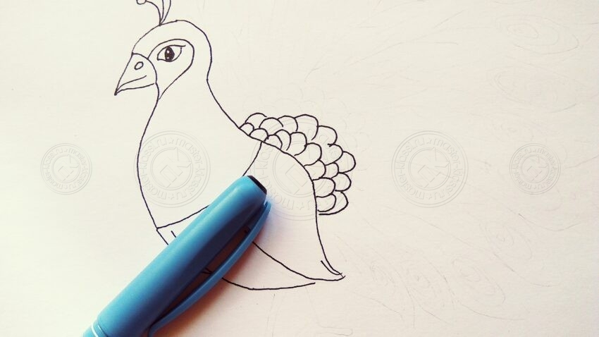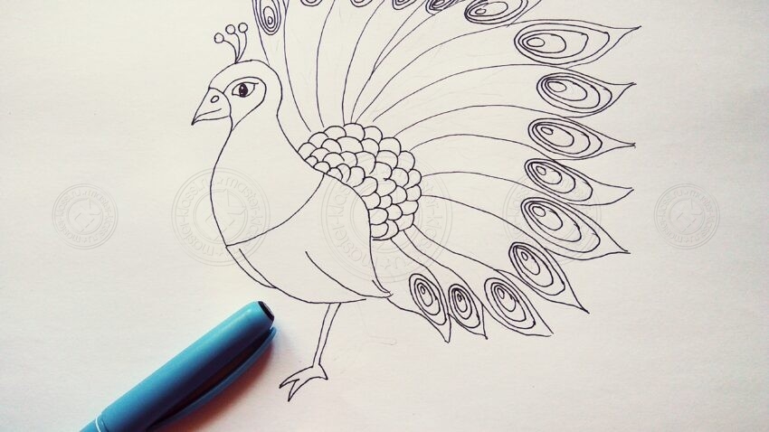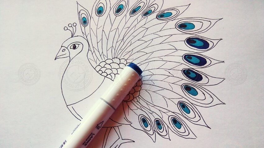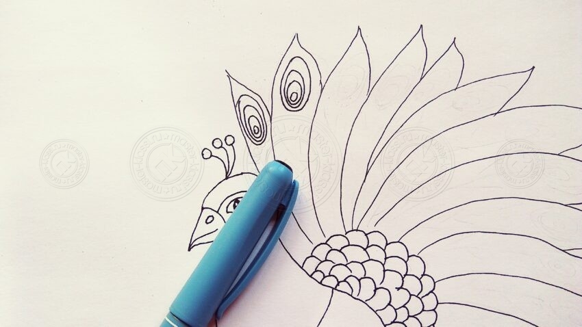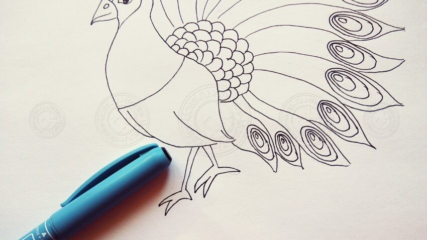В конце обведите контур павлина черной ручкой — готово. Посмотрите, какой красивый он получился. Ниже вы найдете еще несколько вариантов, как можно нарисовать павлина, а фото-инструкции вам помогут.