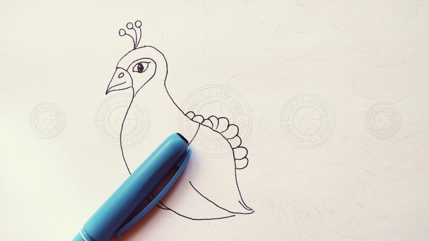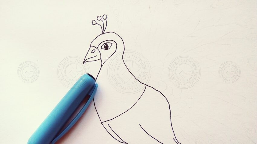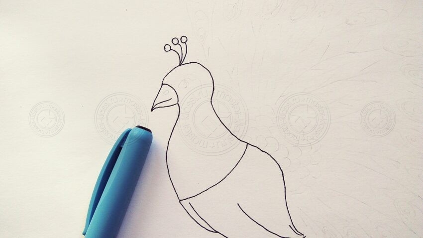 8. Сверху пририсуйте хохолок, состоящий из трех перышек с шариками на концах. Это также отличительная деталь павлина.