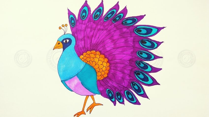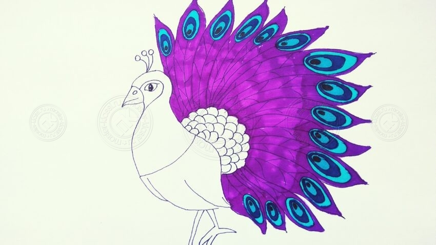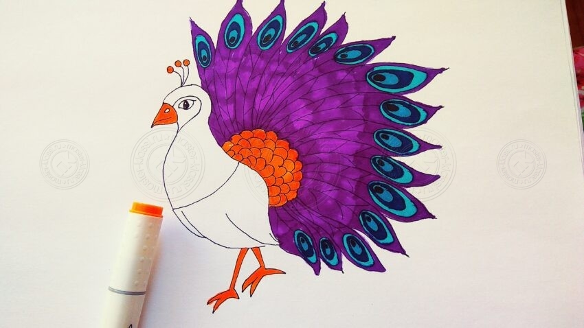 27. Для окрашивания головы, шеи, туловища используйте синий, голубой и сиреневый. Вот и готов ваш павлин. Он нарисован, и рисунок получился действительно ярким и уникальным.