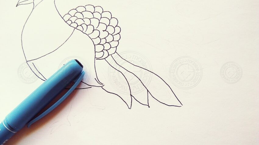 15. Продолжайте прорисовывать хвост, увеличивая длину перьев, и поднимайте рисунок вверх.